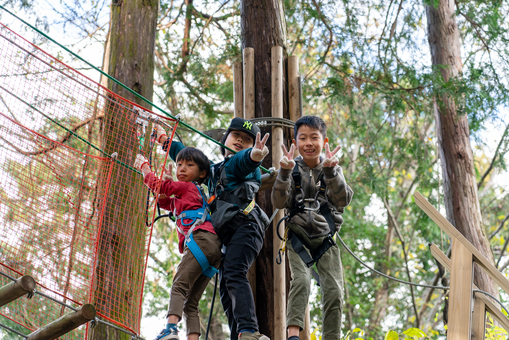 ◎アスレチックのサポート体制・・・施設のインストラクターさんが体験中のお子様に寄り添い、安全見守りをしながら、励まし・アドバイスして少しでも先に進めるようサポートしてくれます。万一の落下防止のため[ハーネス]という安全器具をスタート前に全員装着(スタッフが確認)しますし、コースの下にはセーフティネットが張り巡らされていますので、高い木の上から地面に落下することはありません。