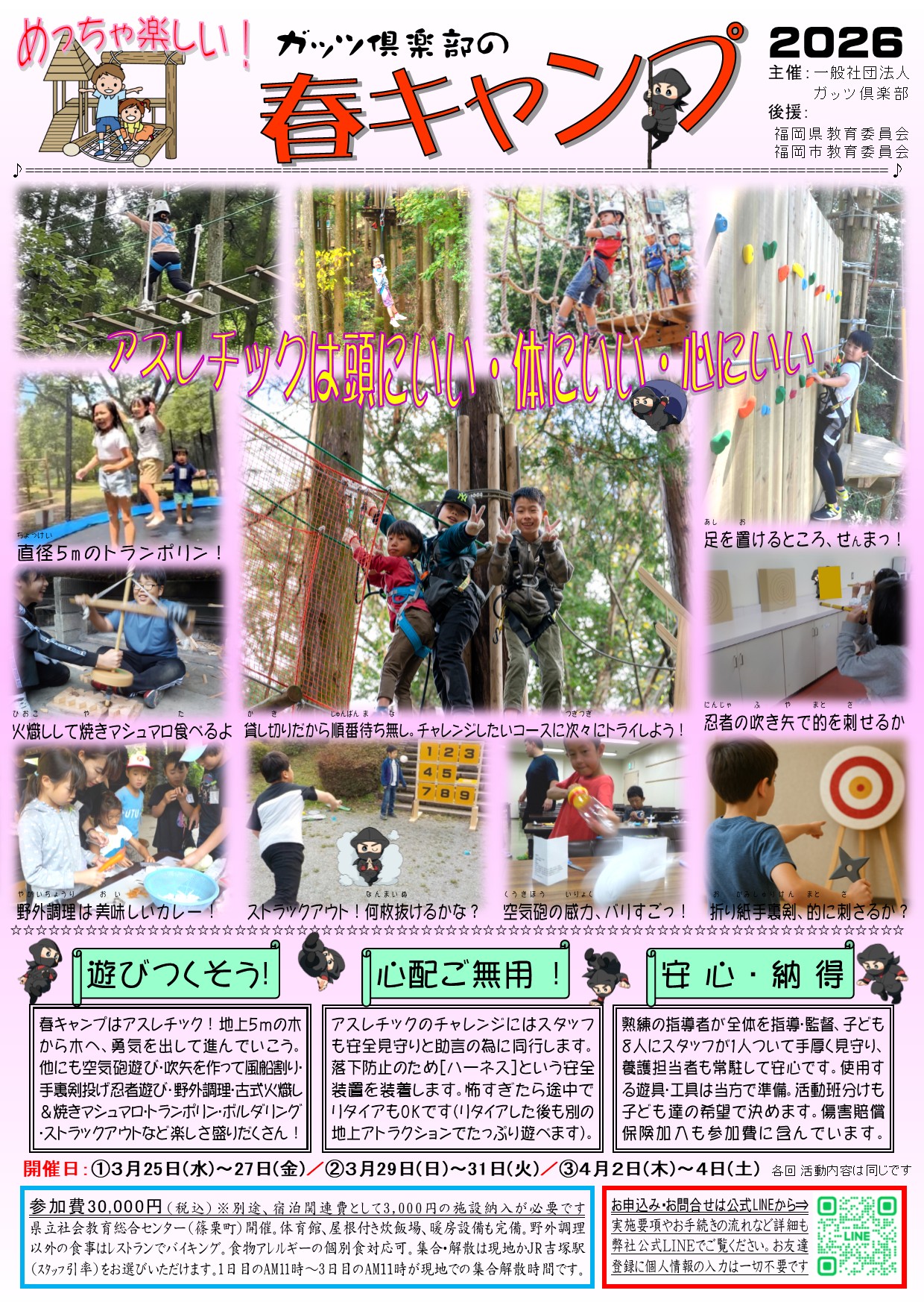 ◎アスレチックだけじゃない・・・アスレチック以外でも、カレーの野外調理・吹矢で風船割り・ペットボトル空気砲遊び・手裏剣投げ忍者ゲーム・縄文式火熾し&焼きマシュマロ・トランポリン・ボルダリング・ストラックアウトなど、作って遊んで・朝も昼も・屋外でも屋内でも、オモシロいことが盛り沢山。春にやれる楽しいこと、全部詰め込んだキャンプです。