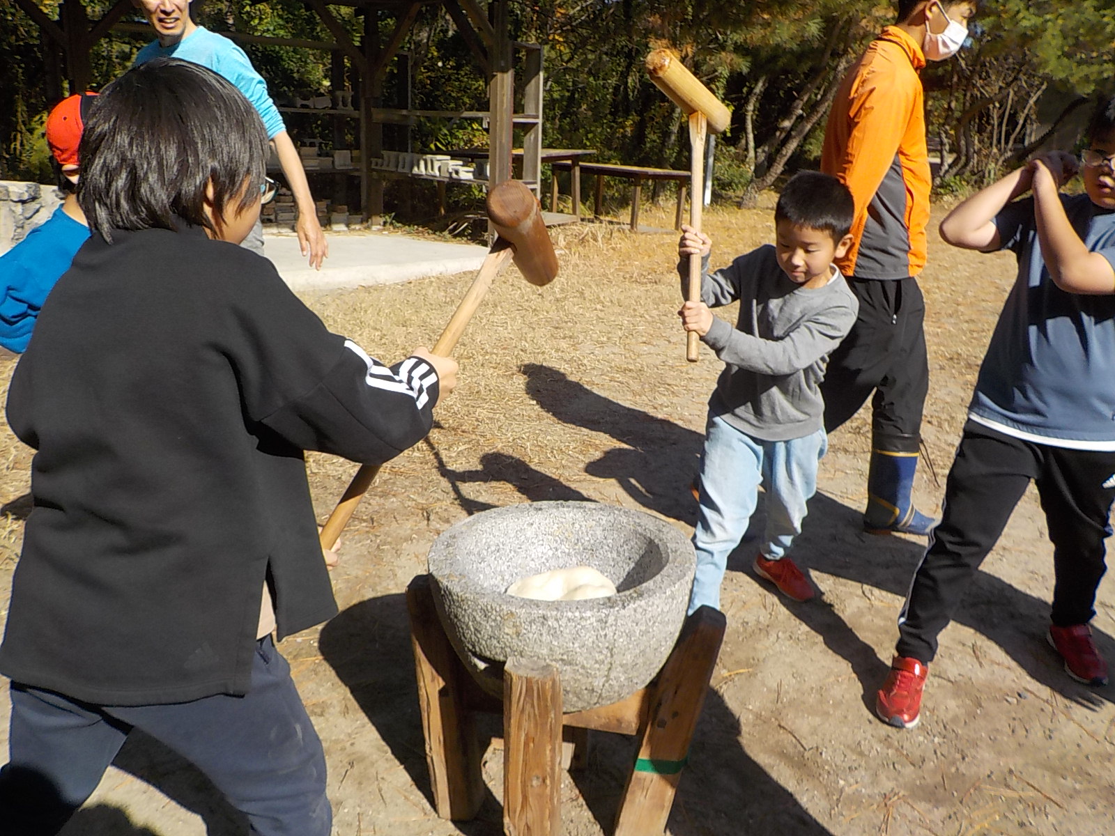 日本の冬の風物詩と言えば「餅つき」!ですよね。セイロで蒸したもち米を石臼に入れて。まずは「おこわ」で餅米本来の味を味わいましょう。それから二人一組、杵でぺったんぺったん搗いてお餅に仕立てます(何度も順番は回ってきます)。2人のリズムと力強さ、仲間の掛け声も大事です。つきたてお餅はお醬油・きなこ砂糖・砂糖醤油・チョコレート、など色んなお味で食べますよ~。